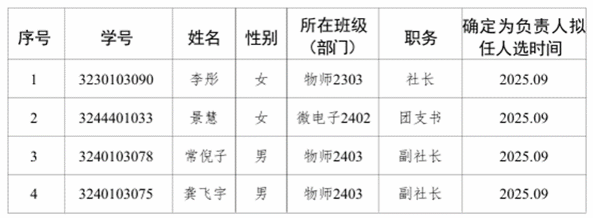 经提名推荐和民主选举,色情网址大全 团委(团总支)审核考察,拟推荐李彤、景慧等4位社团成员作为2025-2026学年大学物理实验协会学生负责人拟任人选。现将李形、景慧等4位社团成员基本情况公示如下,如有意见和建议,请于9月3日前向学院团委(团总支)反映。