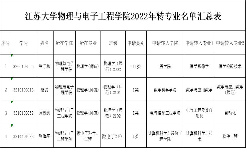 根据《色情网址大全 本科生转专业实施办法》(江大校〔2018〕10号)、《关于做好2022年本科生转专业工作的通知》(江大教〔2022〕56号)等文件精神,经个人申报、学院审核,现将符合条件的同学公示如下:
