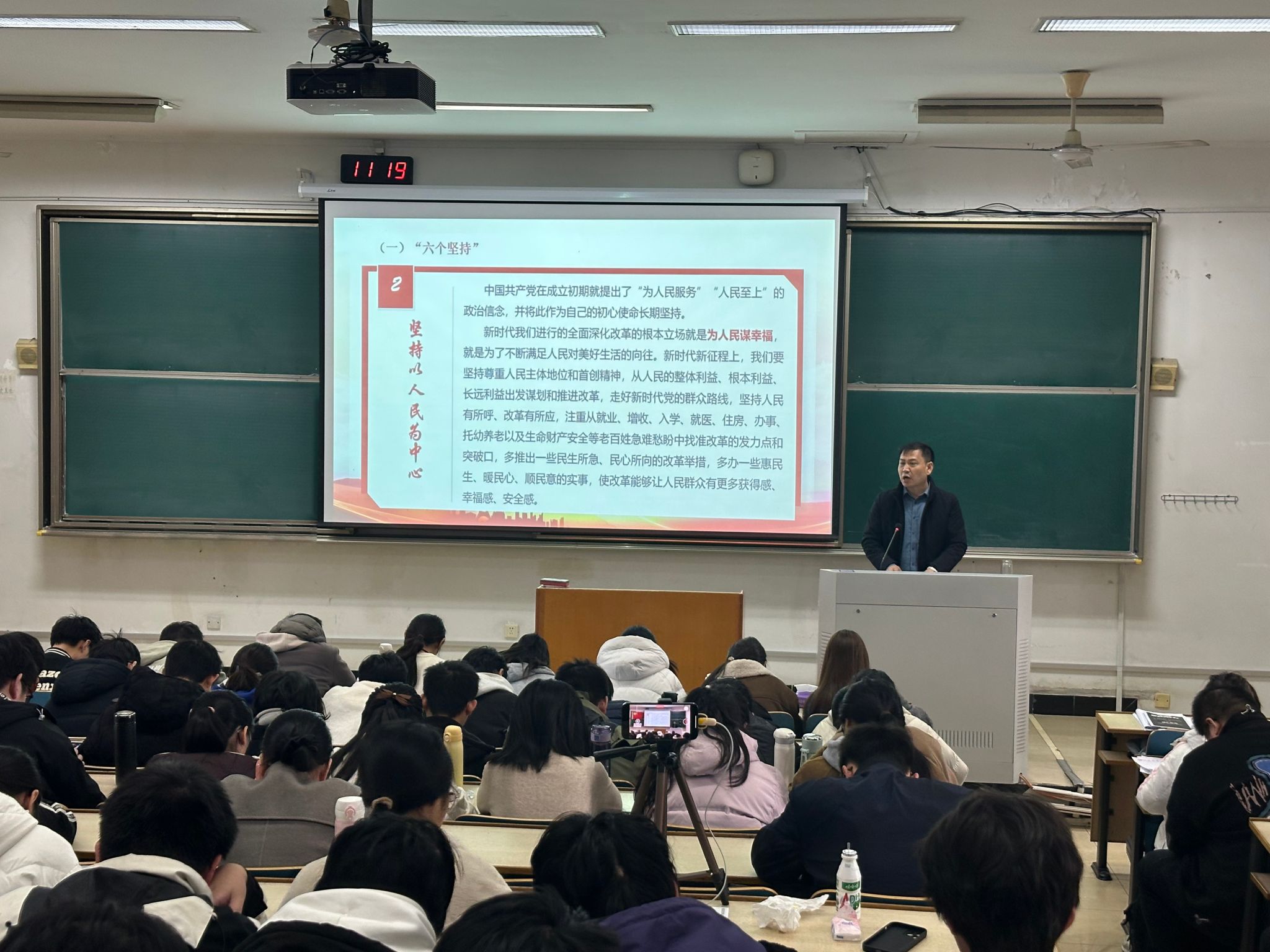 11月22日,院党委书记潘金彪在讲堂群203举办党的二十届三中全会精神宣讲会,学生党员、入党积极分子等参加宣讲会。