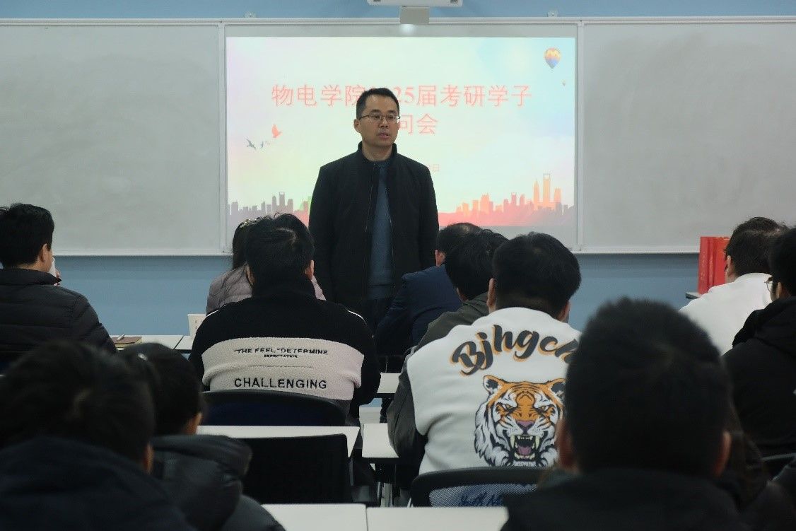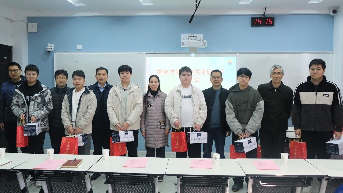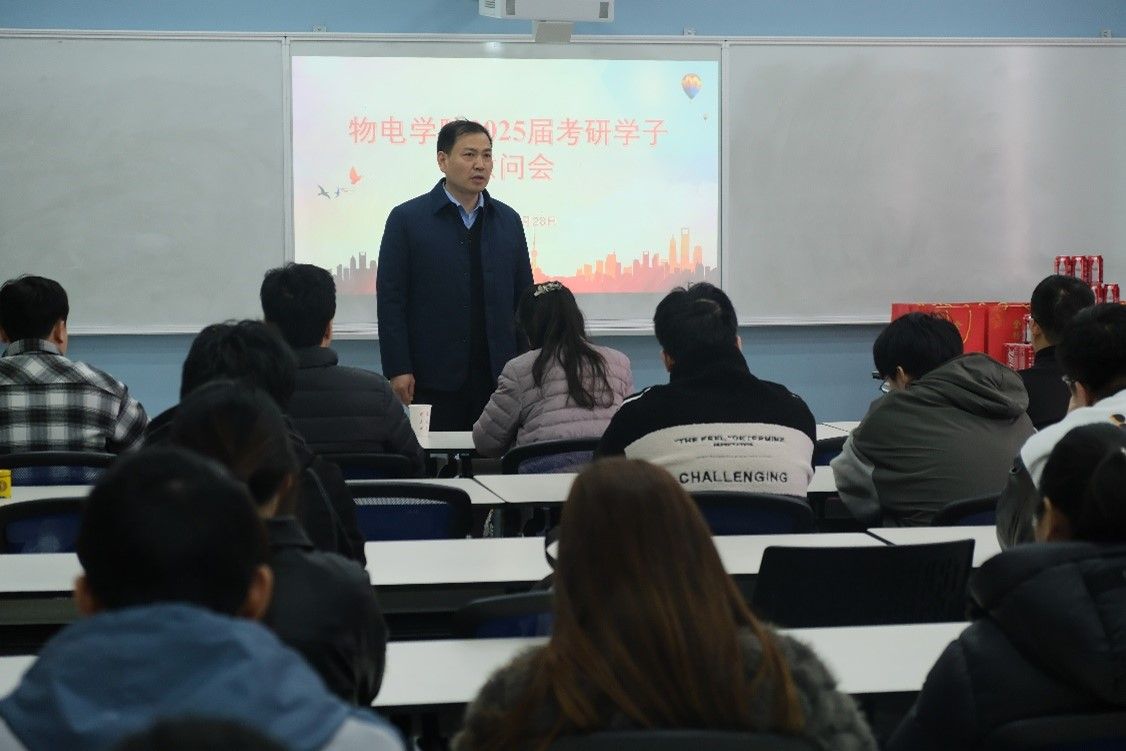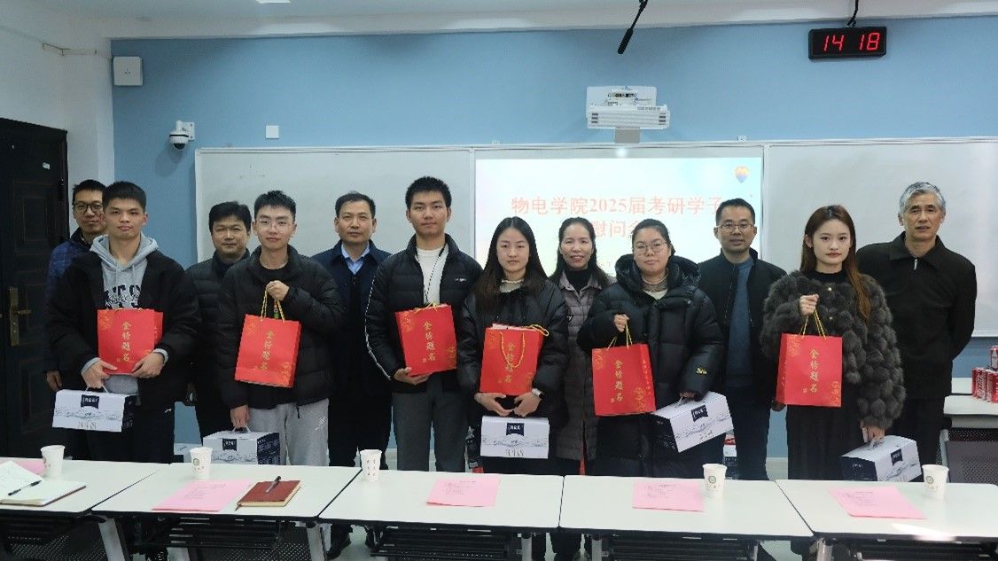 11月28日,色情网址大全 在三山楼802教室举办2025届考研学子慰问会。色情网址大全 党委书记潘金彪,党委副书记、副院长顾瑜婷,副院长徐晶,物理系主任尚学府,微电子系党支部书记刘圆,关工委委员陆正兴,辅导员刘振、杨伟伟参加本次活动,共同为即将踏上考场的考研学子们加油鼓劲。