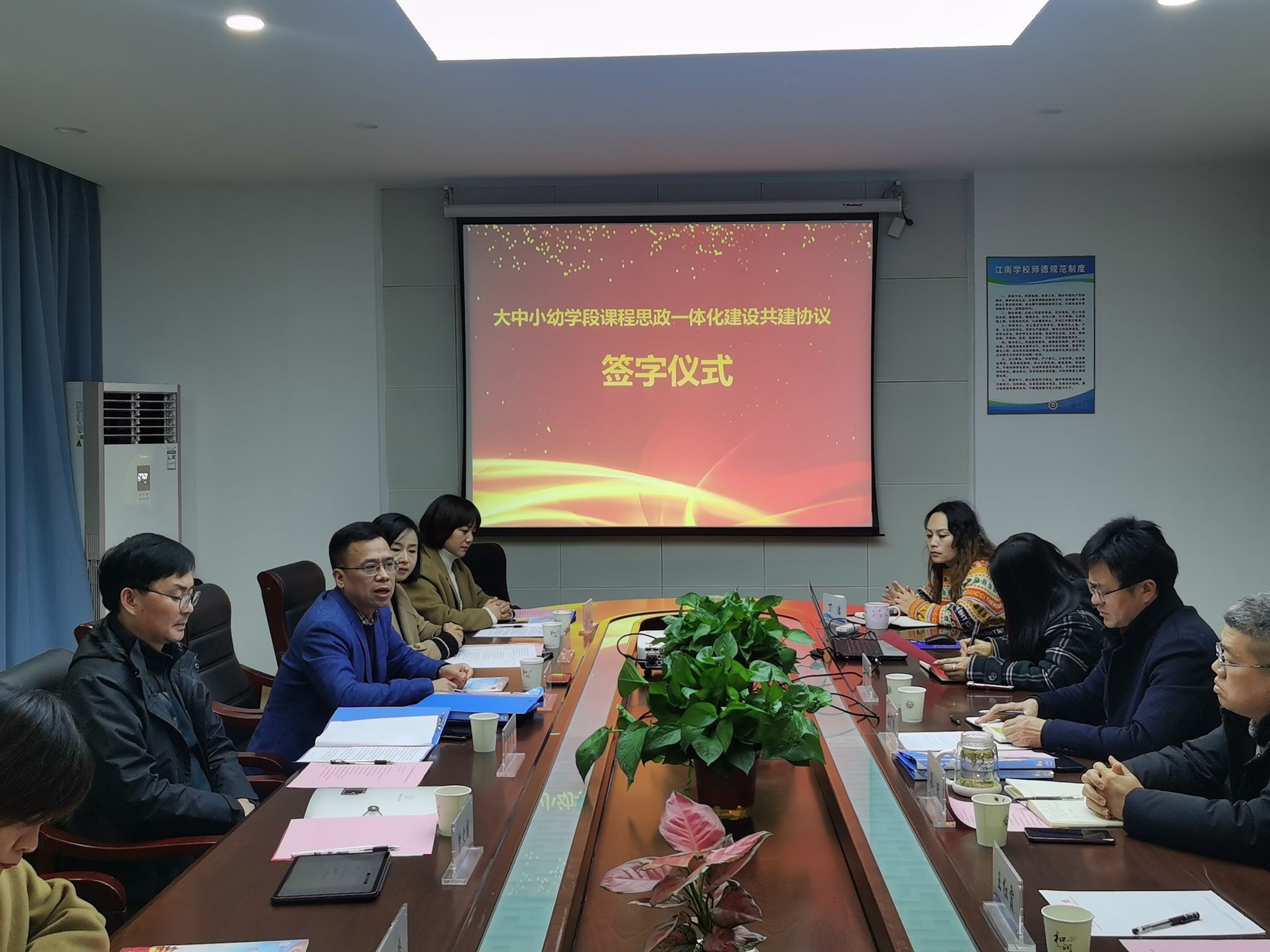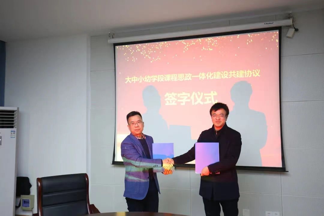 在针对学生培养、教学研究、教研项目申报和科技创新活动等方面的合作进行了广泛交流并达成共识后,各共建单位负责人签订了共建协议,讨论了在镇江市教育局的引领下形成共建专题教研室的机制和步骤。此次课程思政一体化共建协议的签订,不仅有助于拓展我院师范生教学实践基地的广度和深度,更是挖掘并彰显课程的育人价值,推动“课程思政”落地征程中迈出的开创性一步。