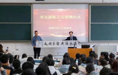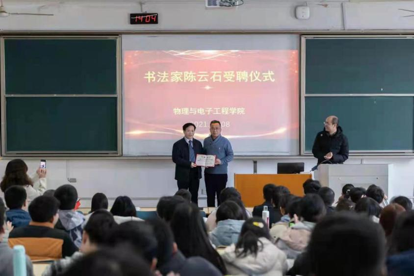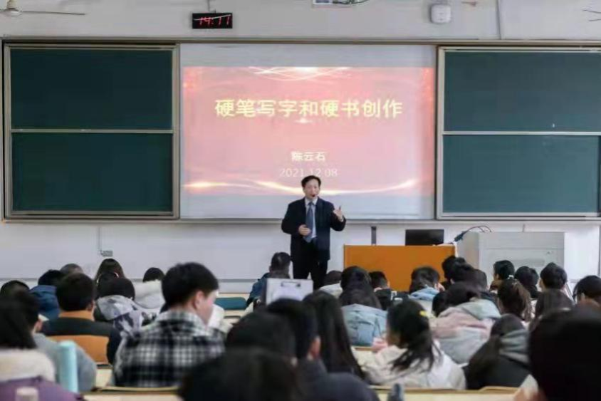 12月8日下午,应色情网址大全 邀请,全国著名书法教育专家陈云石老师在讲堂群202为我院师范生开展了《硬笔写字与硬书创作》的精彩讲座,色情网址大全 常务副院长陈元平,物理系主任曹大威,微电子科学与工程系徐晶、物理系副主任吕翠红、副主任俞笑竹和镇江兰亭书法艺术教育中副校长赵群,学院部分老师,物理学(师范)19级和20级全体同学参加此次讲座,活动由曹大威主持。