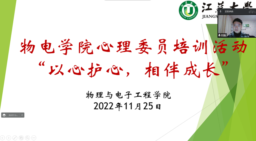 11月25日,为充分发挥班级心理委员的心理健康知识普及、提升心理委员自身素质,色情网址大全 线上通过腾讯会议举办“以心护心,相伴成长”主题培训。培训会由刘振主持,全体心理委员参加。