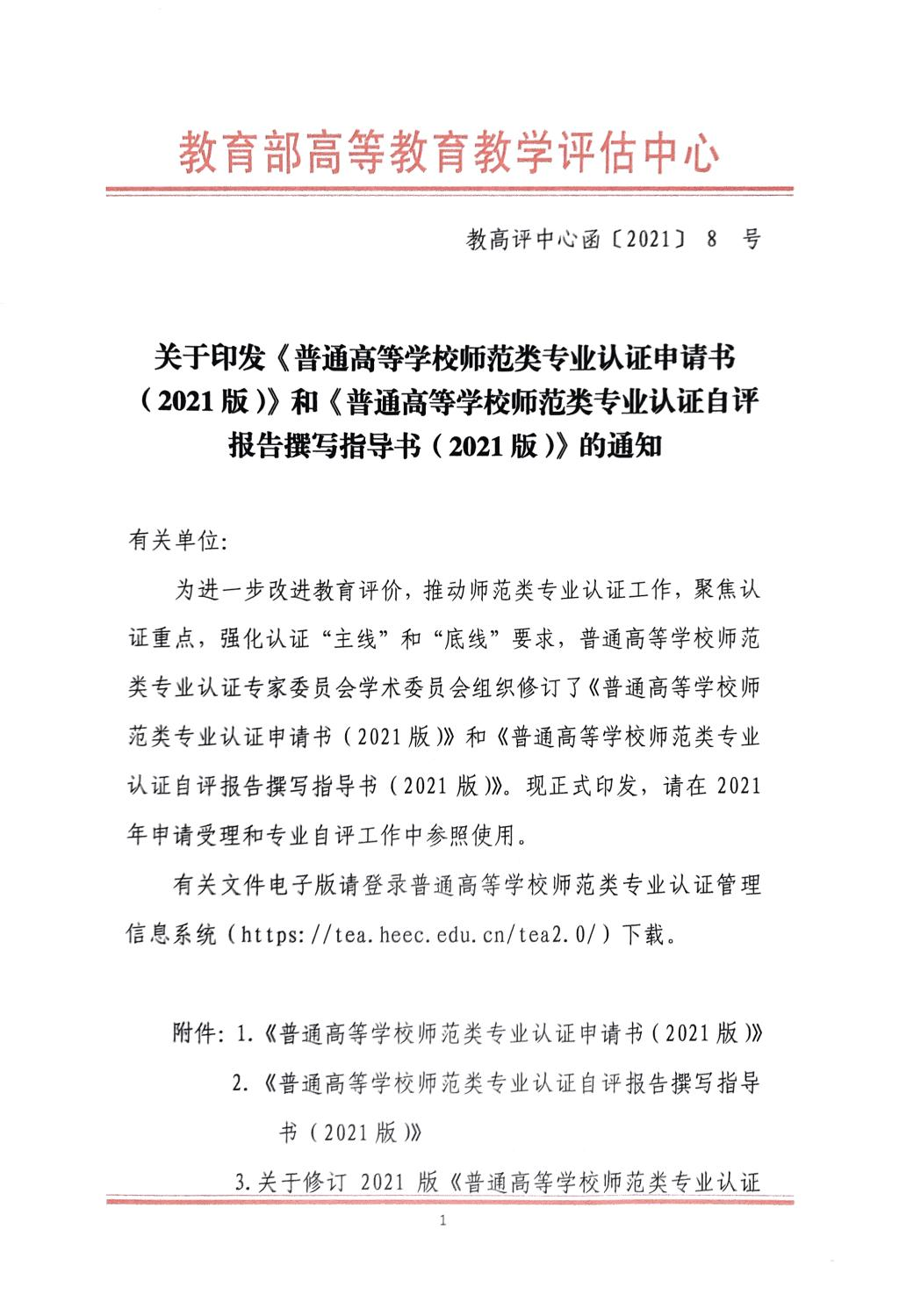为进一步改进教育评价,推动师范类专业认证工作,聚焦认证重点,强化认证“主线”和“底线”要求,普通高等学校师范类专业认证学术委员会组织修订了《普通高等学校师范类专业认证申请书(2021版)》和《普通高等学校师范类专业认证自评报告撰写指导书(2021版)》。现正式印发,请在2021年申请受理和专业自评工作参照使用。