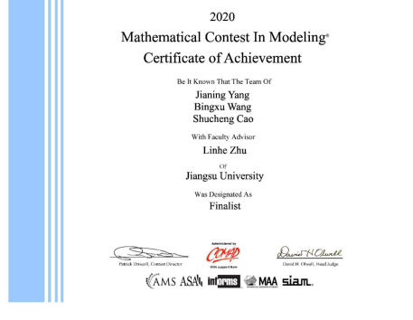 On April 28, the results of the 2020 American College Students Mathematical Contest in Modeling/ Interdisciplinary Contest in Modeling (MCM / ICM) were announced. The team composed by Yang Jianing, Wang Bingxu, and Cao Shucheng, the junior students of Applied Mathematics (Sino-foreign Cooperation) from Faculty of Science (instructor: Zhu Linhe) won the Finalist Prize.