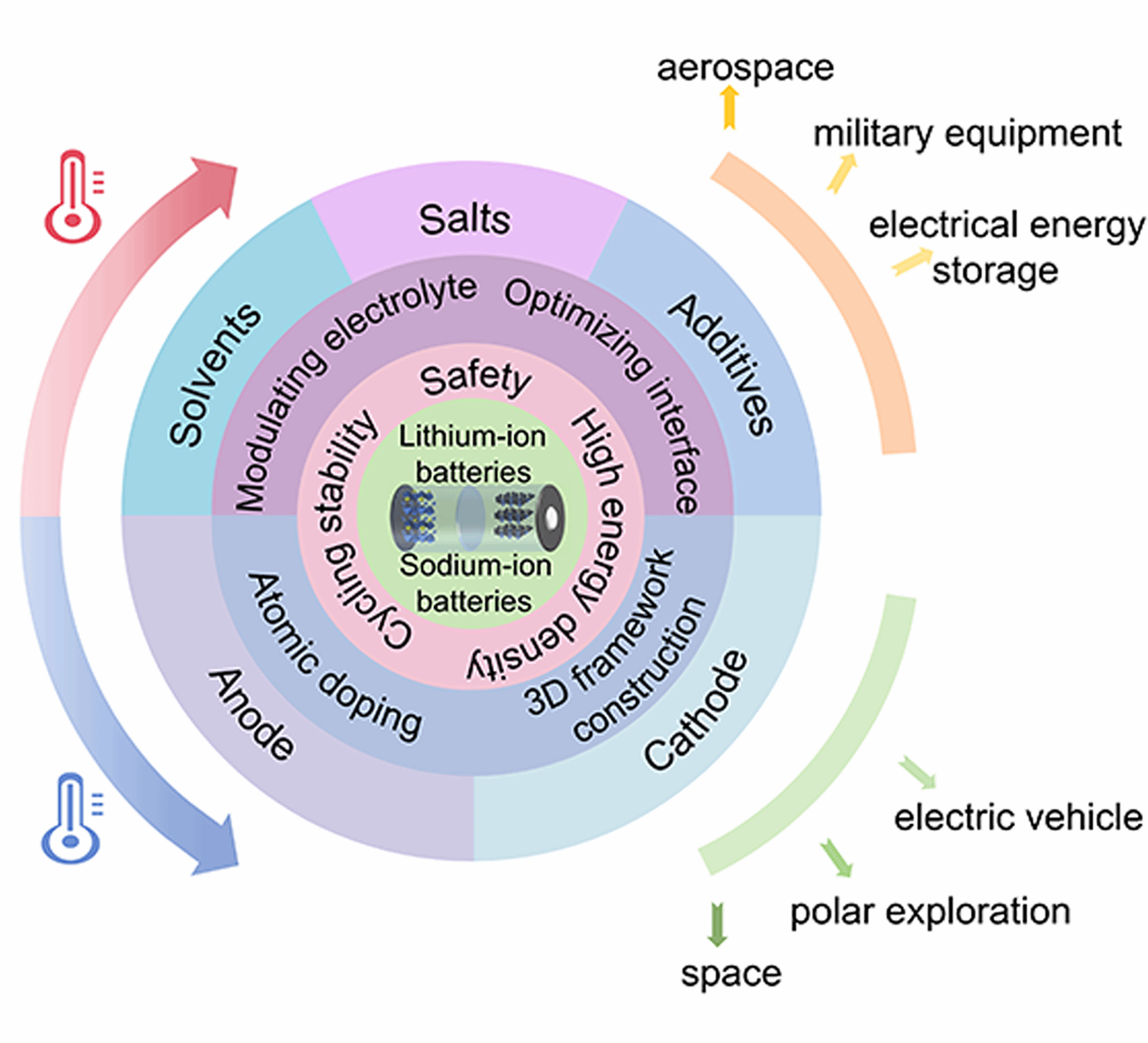 本综述系统探讨了锂离子电池和钠离子电池在极端温度(-70 °C至100 °C)环境下的失效机制与性能优化策略。论文从电解液(溶剂、盐、添加剂、半/固态电解质)和电极材料两方面入手,详细分析了低温下离子传导迟滞、界面阻抗增大以及高温下热稳定性差、副反应加剧等核心问题。作者对比了两种类型电池在极端温度下的性能差异,并总结了包括新型溶剂分子设计、溶化结构调控、界面稳定化以及电极材料改性等关键优化方案。该综述旨在为开发高性能、高安全性的极端环境适用电池提供设计指南。